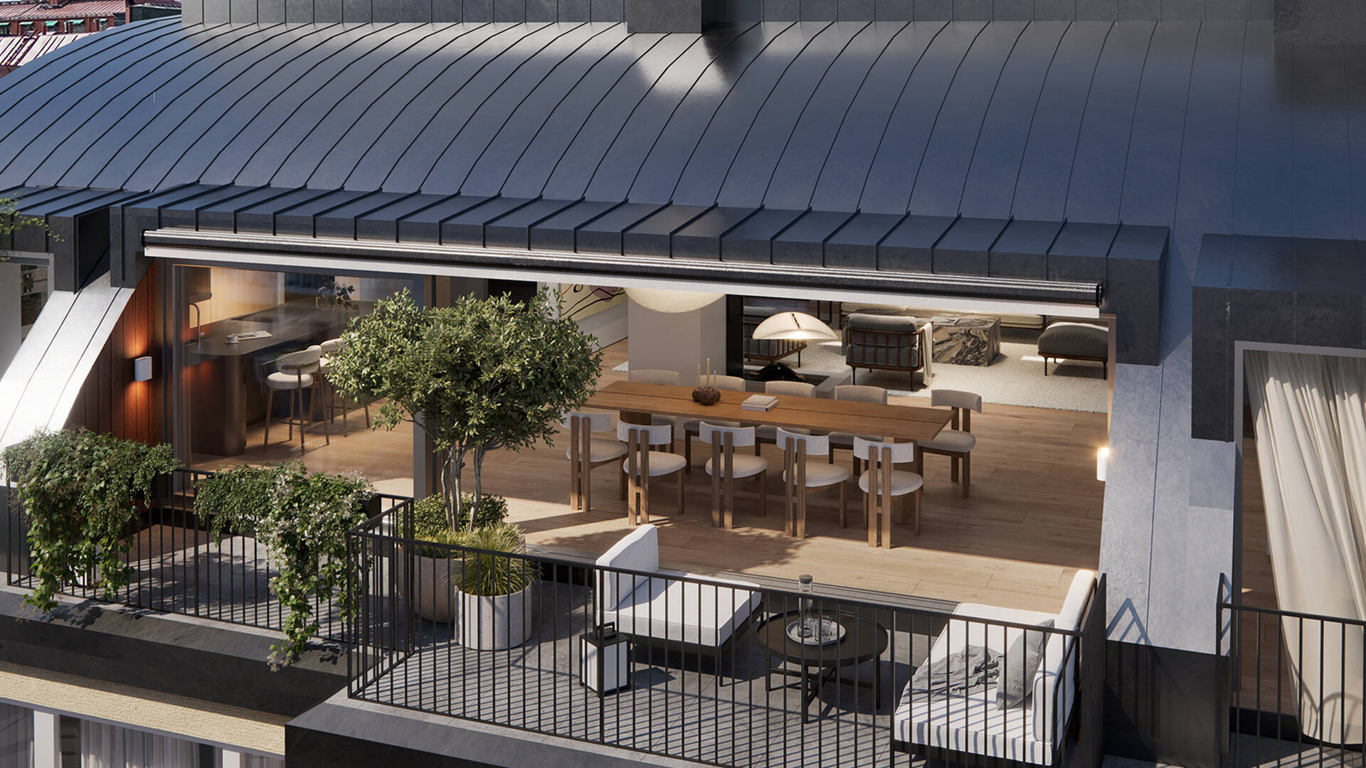 En ljus parisinspirerad vindsvåning under produktion håller på att byggas ett par kvarter från Östermalmstorg. Stor altan i bästa västerläge /../