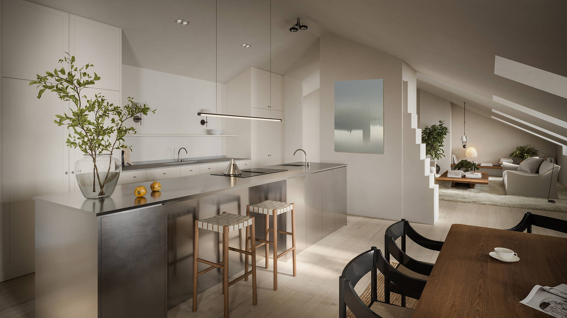 I lugna kvarter med kullersten prydda gator ligger den här spektakulära vindsvåningen om totalt 126 m² golvyta och hiss in i våningen. De välgenomtänkta materialvalen och inredningsarkitekturen ger våningen en unik prägel. Ett smart hem där allt från musik till belysning kan styras med mobilen. Sällskapsdelen badar i ljus och där sommarmiddagar avnjuts med en rosa himmel när solen sakta försvinner över takåsarna. Altanen har fantastisk utsikt mot bl.a Engelbrektskyrkan som lyser som ett smycke på kvällarna. Totalt två generösa sovrum med varsitt lyxigt badrum en suite med bl.a ångbastu. Äkta Brf i vacker fastighet från 1923. Perfekt läge med närhet till vimlet på Stureplan (om så önskas) och grönskan i Humlegården.