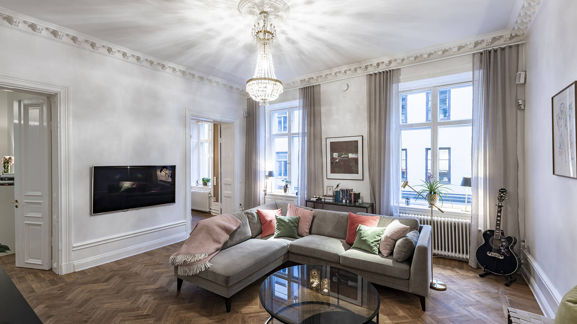 Ljus etagevåning med en härligt välkomnande entré. Hallen har en imponerande rymd med nästan sex meter upp till ett helglasat tak vilket ger ett fantastiskt första intryck. Välutrustat kök med balkong och platsbyggd soffhörna. Separat köksingång med hiss. Generöst vardagsrum med vacker öppen spis och stor matsal med plats för många vänner. Bibliotek/tv-rum. Samtliga rum har utgång till balkong/altaner. Master bedroom har badrum en suite och utgång till den stora, privata altanen om 23 m². Totalt fyra sovrum och tre badrum samt gäst-wc. Äkta Brf med låg belåning som äger marken.